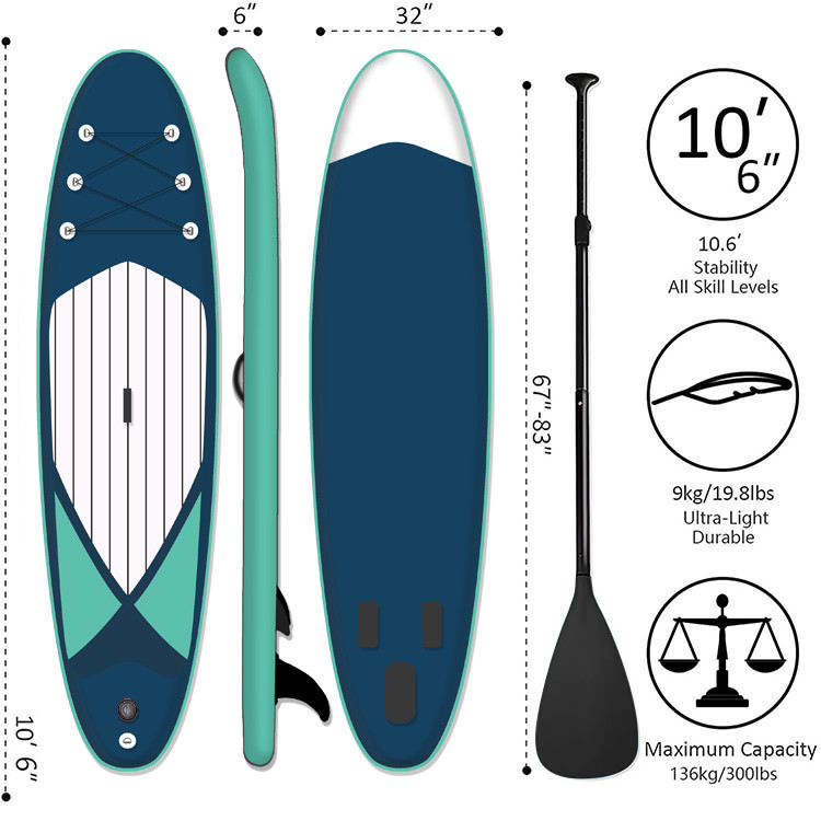 - [Equipo y garantía completos de Paddleboard] paquete incluyendo el tablero inflable, paleta ajustable (paleta superior que flota), un correo en espiral de la seguridad del puño del tobillo, bomba de mano doble de la acción, 1 aleta desprendible, mochila actualizada, equipo de la aleación de reparación.